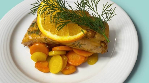 Möhren in Butter schwenken. Lachs mit Salz und Zitronensaft würzen und auf den Möhren anrichten. Mit Orange und Dill garnieren.